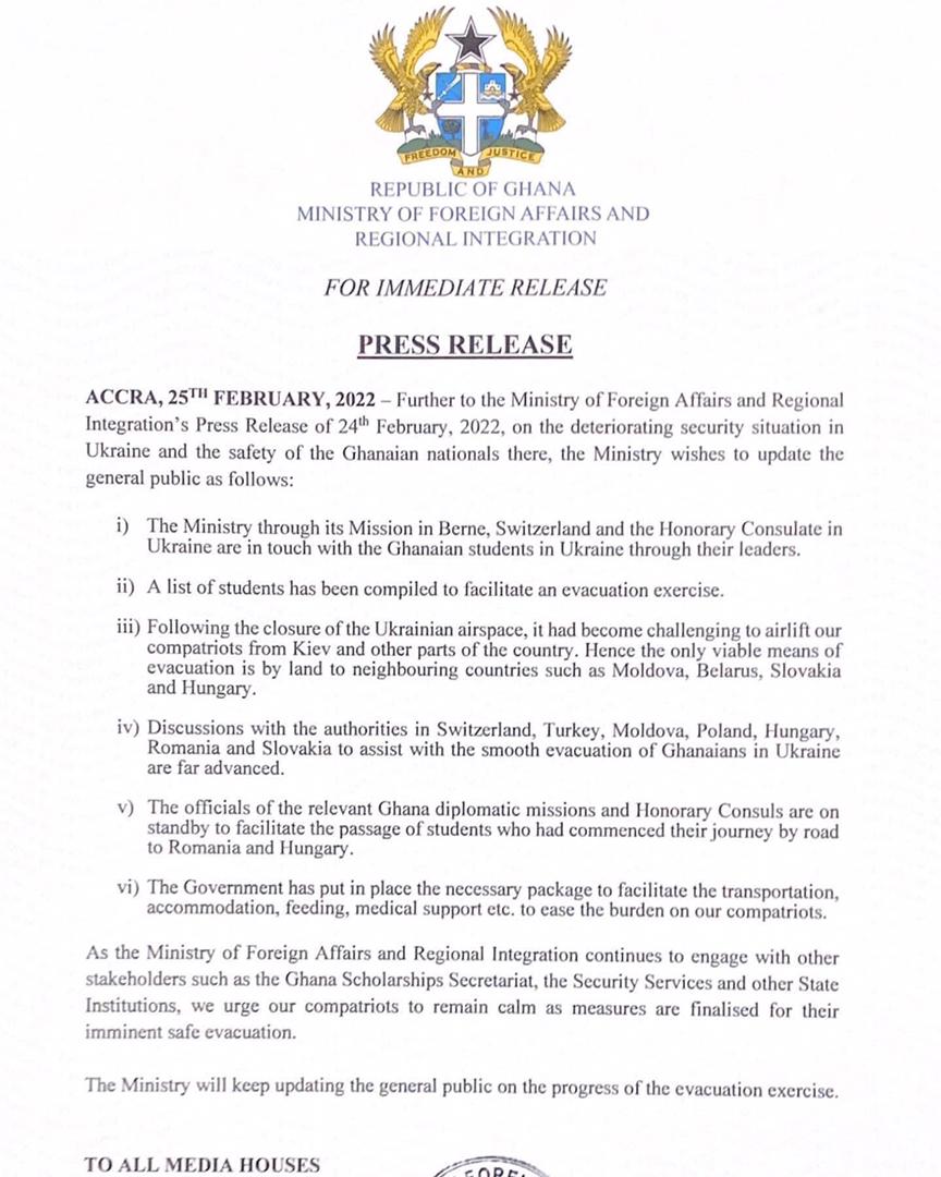 The Ministry of Foreign Affairs and Regional Integration has indicated that the Government of Ghana is in urgent talks neighboring countries of Ukraine to ensure the smooth evacuation of Ghanaian students.